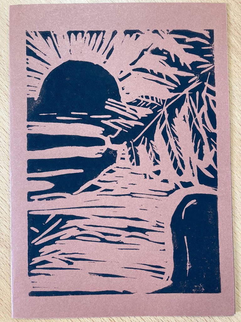 Begeleidster Miek: “De blauwe afdrukken zijn cyanotypes. Het zijn fotografische afdrukken waarvoor je een volle zon nodig hebt. Dus deze zomer hebben we op een zonnige dag deze blauwe prenten van bloemen, planten en veertjes gemaakt. We waren verrast door de scherpe details en de onverwachte abstracte beelden.”