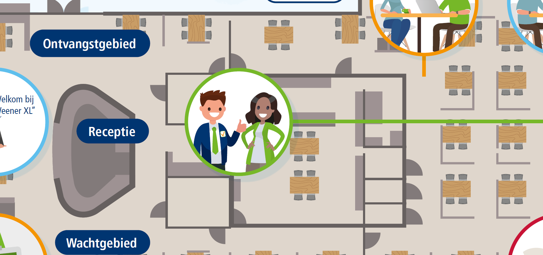 - Het ontvangstgebied is voor onze bezoekers. Overleggen met collega’s doen we zoveel mogelijk buiten het ontvangstgebied.