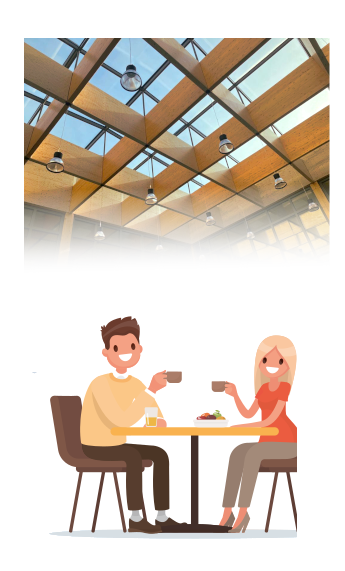 Middenin ons gebouw hebben we een groot restaurant. Hier vind je meerdere zitplekken en een groot aanbod van verse producten. Een paar voorbeelden zijn soepen, broodjes, dranken en meer. Vlak naast het restaurant vind je het eet-/werkcafé (EWC).