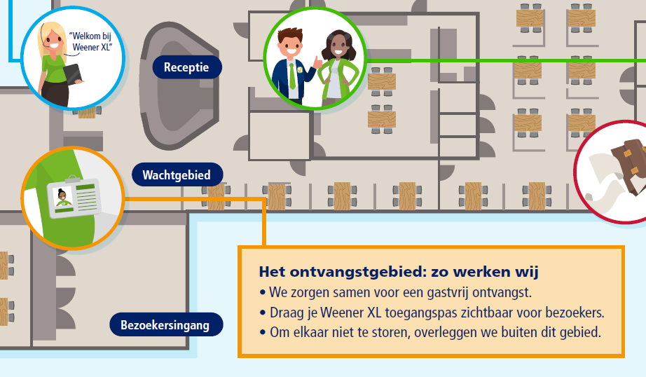 Bezoekers ontvangen wij in ons nieuwe ontvangstgebied. Dat is het gebied rechts van de hoofdingang en receptie. Samen zorgen we voor een gastvrije ontvangst van onze klanten. Hoe we dat doen, lees je in dit handige overzicht met onze afspraken.